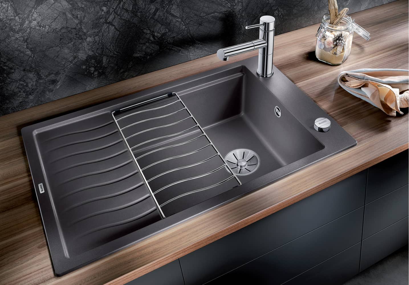 Sudoper Blanco Elon XLSS izrađene je od Silgranita (kompozit akrila i kvarcne prašine). Namjenjen za element 60 cm širine, ima jedno korito dimenzija 45 x 41 cm i usku plohu za cijeđenje široku 30 cm. Dubina korita je 19 cm. Uz sudoper isporučuje se dodatak od nehrđajučeg čelika koji u slučaju potrebe proširuje plohu za cijeđenje. U paketu je i sifon koji oblikom štedi prostor u elementu ispod sudopera. Više o sudoperu →